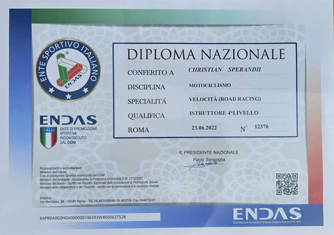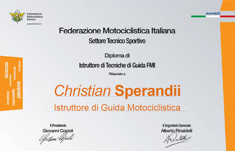 Dal 2019 ha conseguito tutte le certificazioni di enti di promozione motociclistica sportiva affiliate al CONI e tesserini tecnici come istruttore di guida On road ed Off road, e nel 2022 quello di ITGM della FMI.
